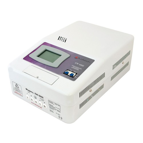 Конструктивно выполнен в металлическом белом корпусе с ЖК дисплеем на котором отображается информация о входящем выходящем напряжении, мощности нагрузки и температуре внутри корпуса. Также на ЖК дисплей выводится код ошибки в случае аварийного отключения стабилизатора. Допустимое входящее напряжение находится в пределах 95-280В. В серии EW предусмотрен режим транзит(Обход) в который его можно переключить при помощи автомата на передней панели стабилизатора.