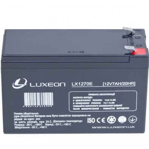 Luxeon LX1270E - свинцово-кислотные, герметичные, необслуживаемые аккумуляторные батареи. Крепление: горизонтальная установка на поверхности. Разряжайте батарею один раз в месяц. После разряда батарею необходимо полностью зарядить.