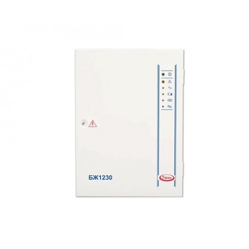Клеммы выходного напряжения БЖ 1230 продублированы для возможности распределения нагрузки. Дополнительно БЖ 1230 имеет выходы для передачи сигнала «общая неисправность» и «неисправность основного источника питания». БЖ 1230 рассчитан под АКБ 7/18 А*ч (12В). Максимальный выходной ток 3А.