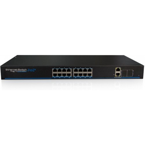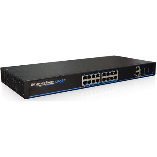 • Основные порты: 16 (100Мб/с) портов PoE+ нисходящей линии, 2 гигабитных порта восходящей линии, и 1 гигабитных оптический Combo порт;