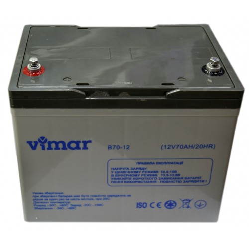 Гелевый аккумулятор VIMAR B70-12 12В 70АЧ заметно отличается от своих конкурентов благодаря множеству преимуществ. Например, он обладает значительной ёмкостью для такого размера и при таком малом весе. Является полностью герметичным и безвредным для окружающих людей. Имеет удивительно большой ресурс работы, примерно 5-7 лет, что позволит вам надолго забыть о его существовании. Устройство относится к разряду необслуживаемых батарей и не требует специальных навыков при использовании. Все эти высокие показатели подтверждены успешным опытом использования данного прибора во многих странах.