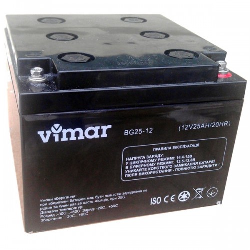 Гелевый аккумулятор VIMAR BG25-12 12B 25АЧ позволит почувствовать себя свободным от источника постоянного электропитания. Корпус модели абсолютно герметичен и не требует какого-либо обслуживания. Устройство может работать в широком температурном диапазоне. Кроме того, такая батарея обладает очень низким саморозрядом, примерно 3 % в месяц. В отличие от свинцово-кислотных аккумуляторов такая модель может работать при более низких температурах без потери ёмкости. В случае же глубокого разряда, прибор имеет очень низкую степень тепловыделения. Вам безусловно понравиться такой тип аккумулятора.