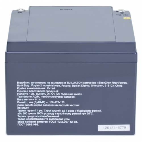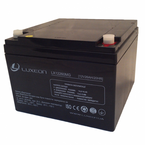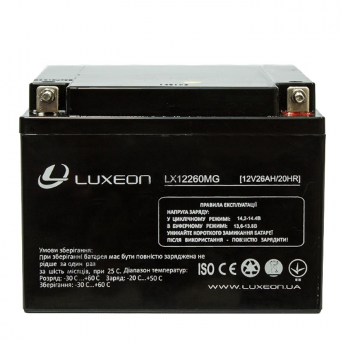 Мультигелевый аккумулятор LUXEON LX12260MG предлагается как устройство обеспечения питания с номинальным напряжением 12 Вольт и емкостью 26 Ач. Данная аккумуляторная батарея оснащена круглыми резьбовыми клеммами под болт М5, изготовленными из луженной меди, что обеспечивает более надёжное крепление кабеля питания. Также для обеспечения герметичности выводы аккумулятора залиты синтетической смолой.