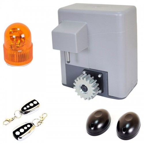 Комплектация: блок привода с автоматикой, 2 пульта управления, ИК барьер, сигнальная лампа, 4 зубчатые рейки по 1 метру каждая и 2 ограничителя на рейку концевика.