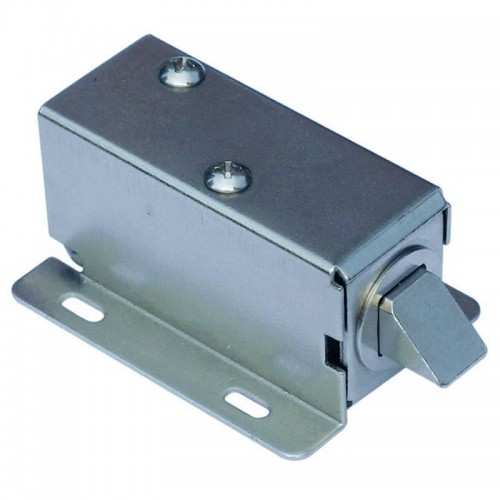 Электрозамок изготовлен из металла, который окрашен в темно-серый цвет. Благодаря своим небольшим габаритным размерам (54.5х41х28 мм) он достаточно легко и просто монтируется на поверхность и его установка не займет много времени. Длина контакта составляет 10 мм., а его диаметр также 10 мм. Среди особенностей устройства стоит отметить возможность открытия его ключом.