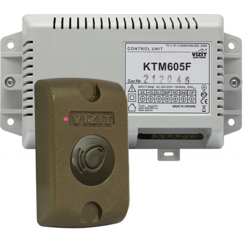 Контроллер ключей  VIZIT-КТМ605F. Открывание замка входной двери ключами VIZIT-RF3 (до 2680 ключей); привязка ключей к установленному PIN-коду; запись пользовательских ключей, ключей ОХРАНЫ и МАСТЕР ключа; звуковая сигнализация и световая индикация режимов работы; питание и управление открытием замка; таймер (1 или 7 сек); питание индивидуальных домофонов VIZIT; габариты: 165х90х60 мм; температура окружающей среды блока управления: +1°...+ 40°C; температура окружающей среды считывателя ключей: -40°...+ 50°C.