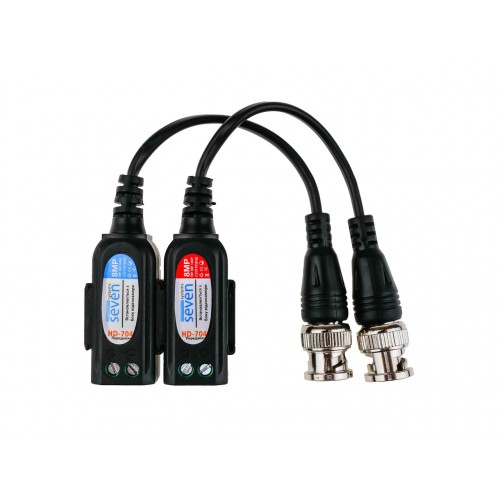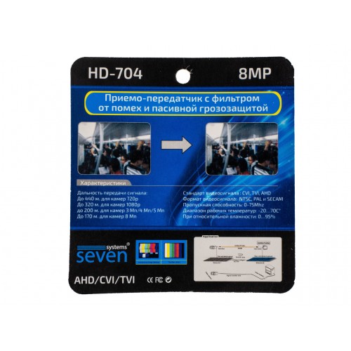 Приемо-передатчик по витой паре (видео балун) SEVEN HD-704 представляет собой устройство, позволяющее  передавать аналоговый видеосигнал по витой паре. Используется в паре на передающем и принимающем концах видео линии.  Данная модель позволяет без потери качества передать видеосигнал с разрешением от 1до 8 Мп на расстояние до 420 метров. Это позволяет существенно экономить  на кабеле, при этом не жертвуя качеством картинки.